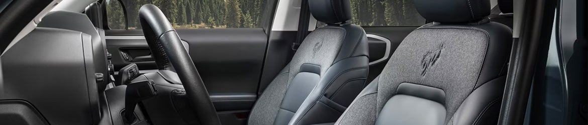 The Bronco® Sport SUV goes in prepared with durable surfaces and creative cargo areas, like the rear-flip-up glass feature. Experience the rush of the open air with the available power moonroof. Plenty of room with 65.2 cu. ft. of cargo* volume behind the first row. Standard on the Big Bend®, Heritage, and Bronco® Sport Free Wheeling™ and Outer Banks® models. Badlands® (shown) has an available cargo capacity of 60.6 cu. ft. behind the first-row. Ready for whatever the day brings. The 2025 Ford Bronco® Sport SUV has a durable, tough and available easy-to-clean interior. There’s room for your whole group. Every model has seating for up to five, with comfortable contoured bucket seats and ample interior space. Make room for your friends and your gear with a flexible interior and multiple places to store equipment. The extra height provided by the safari-style roof means more space for your stuff and lots of head room for tall friends. * There’s even enough cargo room to fit two bikes standing up when equipped with an available interior bike rack. If you need more room for storage, the Bronco® Sport Badlands® model offers additional space under the second-row passenger seat. Room for more. The second-row seats fold flat to expand your cargo area. When the seats are folded down, the Bronco® Sport Badlands® (shown) has an available cargo capacity of 60.6 cu. ft. behind the first-row. All other Bronco Sport models have an available 65.2 cu. ft., behind the first row.