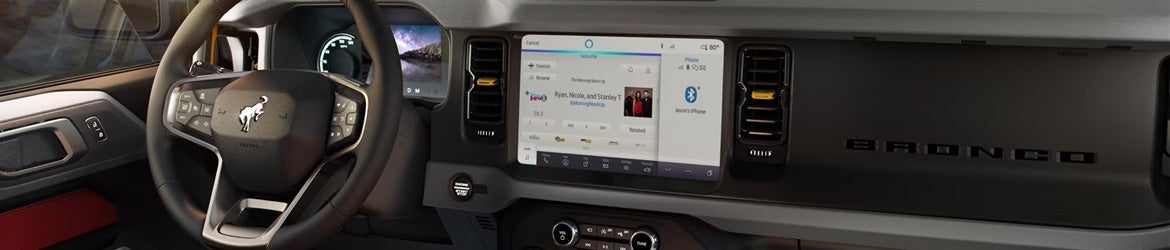 Innovative design and technology. Extreme durability testing. Real-world capability. It’s in the DNA of every Bronco® SUV. All for those who live, work and play outdoors. A solid, ground-gripping 4x4 powertrain and Terrain Management System™. Radical approach, break-over and departure angles. All working together to help you venture out as far as you want. Approach. Brake-over. Departure. Bronco® SUV has the angles that can take on the sharp drops, steep inclines and unexpected off-road encounters. Safely and easily hop over sharp rocks, logs and other nasty obstacles. A high-mounted air intake lets you power through creeks, streams and muddy bogs. With its additional clearance, you’ll have the ability to venture out into the untamed places few others can reach. And return. Guarding critical undercarriage components, available bash plates protect the fuel tank, engine/transmission and transfer case shields. Conveniently accessible from the dash, engage and disengage your off-road essentials. Including front-locking and rear-locking differential, available Trail Turn Assist and available sway-bar disconnect.